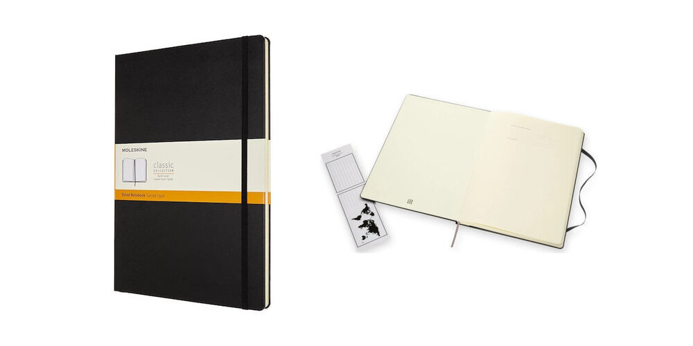 Der Moleskine ist der Klassiker unter den Notizbüchern: fester Einband, Gummiband, Lesezeichen, chlorfrei gebleichte, fadengeheftete Seiten und eine aufklappbare Innentasche für Notizen. Perfekt für Gedanken, Berechnungen und Grafiken. Vielleicht bald deins?