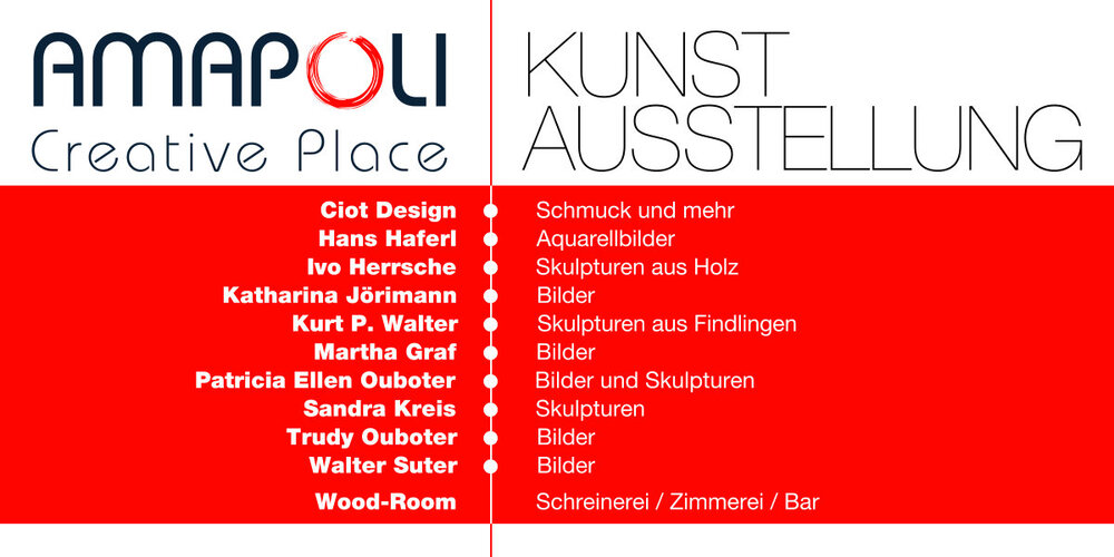 Links / Weitere InfosVom 2. bis 11. September 2022 findet an zwei Wochenenden wieder die beliebte AMAPOLI Kunstausstellung in Bertschikon statt. Zehn Kunstschaffende präsentieren ihre Werke. Ein Teil des Erlöses wird wiederum gespendet.