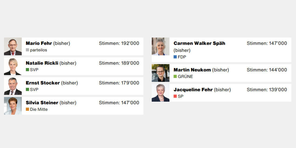 Gemäss erster Hochrechnung hat Mario Fehr (bisher, parteilos) mit 192'000 am meisten Stimmen erhalten, dicht gefolgt von Natalie Rickli (SVP, bisher) mit 189'000 Stimmen. Den dritten Platz nimmt Ernst Stocker (SVP, bisher) mit 179'000 Stimmen ein. Silvia Steiner (Die Mitte, bisher) und Carmen Walker Späh (FDP, bisher) belegen mit 147'000 Stimmen den 4. Platz.