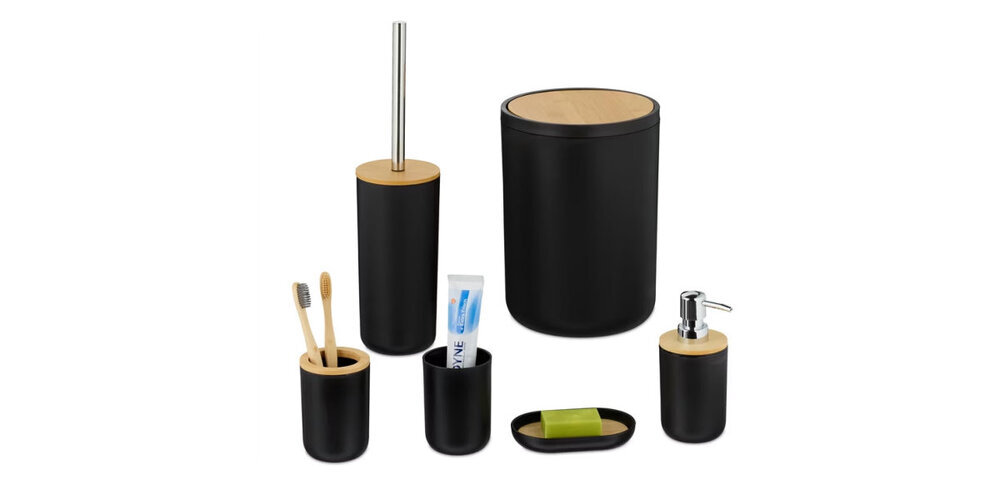 Unser heutiger Wettbewerbspreis ist ein elegantes 6-teiliges Badezimmerset in matt-schwarz mit Bambus-Akzenten. Es umfasst Kosmetikeimer, Seifenspender, Seifenablage, Zahnputzbehälter, Zahnbürstenbecher und WC-Garnitur – praktisch und harmonisch aufeinander abgestimmt. Vielleicht schon bald bei dir zu Hause?
